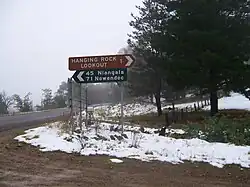 Hanging Rock is a gold mining village and also rock face on the Northern Tablelands, New South Wales, Australia. This former gold mining town is situated about 10 km south east of Nundle. The village is part of the Tamworth Regional Council district and Parry County. Hanging Rock's geographical coordinates are 31° 29′ 0″ South, 151° 12′ 0″ East and the elevation is about 1100 m. Due to the high altitude of the village, Hanging Rock and the surrounding mountains can occasionally receive a snow fall on the coldest of winter days. At the 2021 census, Hanging Rock had a population of 98.[1]