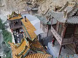 The Hanging Temple, also Hengshan Hanging Temple, Hanging Monastery or Xuankong Temple (simplified Chinese: 悬空寺; traditional Chinese: 懸空寺; pinyin: Xuánkōng Sì) is a temple built into a cliff (75 m or 246 ft above the ground) near Mount Heng in Hunyuan County, Datong City, Shanxi Province, China. The closest city is Datong, 64 kilometres (40 mi) to the northwest. Along with the Yungang Grottoes, the Hanging Temple is one of the main tourist attractions and historical sites in the Datong area. Built more than 1,500 years ago, this temple is notable not only for its location on a sheer precipice but also because as a Buddhist temple it also contains references to the other two of the three Chinese traditional philosophies or religions (三教): Taoism, and Confucianism. The structure is kept in place with oak crossbeams fitted into holes chiseled into the cliffs. The main supportive structure is hidden inside the bedrock.[1] The monastery is located in the small canyon basin, and the body of the building hangs from the middle of the cliff under the prominent summit, protecting the temple from rain erosion and sunlight bake.