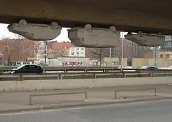 Hangover is an art inspiration in Hanover, Germany, made by Andreas von Weizsäcker. It consists of three sculptures of Volkswagen cars made from polyester, aluminium, and paper, and hang upside-down beneath the Rasch Square Overpass, at the Rasch Square, within the district of Mitte. The installation was first temporary unveiled in 1991, and subsequently removed, before being permanently reinstalled in 1993.