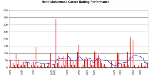 Hanif Mohammad PP (21 December 1934 – 11 August 2016) was a Pakistani cricketer.[1] He played for the Pakistani cricket team in 55 Test matches between the 1952–53 season and the 1969–70 season. He averaged 43.98, scoring twelve centuries. At his peak, he was considered one of the best batsmen in the world despite playing at a time when Pakistan played very little Test cricket; Hanif played just 55 Test matches in a career spanning 17 years. In his obituary by ESPNcricinfo, he was honoured as the original Little Master, a title later assumed by Sunil Gavaskar and Sachin Tendulkar.[2] He was the first Pakistani to score a triple hundred in a Test match.[3]