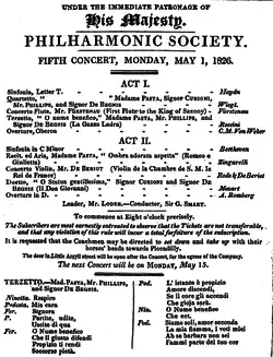 The concert hall there, where concerts started under Bach in February 1775, became one of the principal musical venues in London. For these concerts the convention was that "The Ladies' tickets are Black, and the Gentlemen's Red."[3] An entry from April 1776 in the diary of Edward Piggot gives the following description of a concert:[4]
