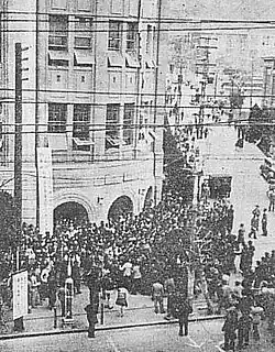 The protestors stormed the Hyogo Prefecture Office Building, and held the governor, the prefectural police chief, and officers of the Allied Occupation as hostages in an attempt to coerce them to rescind their decision to close the Korean ethnic school.[1][2][3] While an agreement was briefly agreed upon, the Japanese and the U.S. government broke the deal, declared a state of emergency in Hyogo, and arrested thousands of Koreans living throughout the city.[1][3]