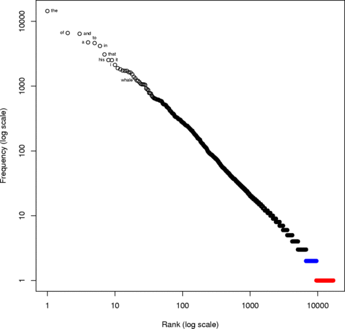 Rank-frequency plot for words in the novel Moby-Dick. About 44% of the distinct set of words in this novel, such as "matrimonial", occur only once, and so are hapax legomena (red). About 17%, such as "dexterity", appear twice (so-called dis legomena, in blue). Zipf's law predicts that the words in this plot should approximate a straight line with slope −1.