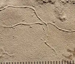 Haplotichnus is an ichnogenus of invertebrate trace fossil that was erected by S.A. Miller in 1889.[1] Buatois et al. (1998) proposed that Haplotichnus should be synonymized with Gordia because both exhibit a looping course with self-crossing.[2] Other researchers, such as Wang et al. (2009), have maintained the distinction between the two ichnogenera because Haplotichnus has sharp bends, whereas those of Gordia are not sharp.[3] Most recently, Getty and Bush (2016) synonymized Haplotichnus with Treptichnus due to the presence of bifurcating projections at the bends.[4] Other features, such as the looping course of the trace, thought to distinguish Haplotichnus from Treptichnus, are actually seen in one of the syntypes of Treptichnus, further supporting Getty and Bush's (2016) synonymy.