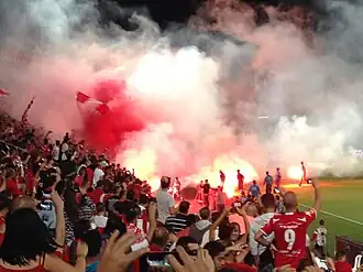Ultras Hapoel often wave flags emblazoned with the faces of Che Guevara and Karl Marx, as well as banners with the slogan "Workers of the world, unite!".[13] The club ultras has friendships with many other antifa supporter groups, including strong bonds with fans of FC St. Pauli, Standard Liège and Omonia Nicosia.[9][10][11][12] In May 2013 Ultras' members founded the band "Lea Katmin" which sang songs from the stands of the fans.[14]