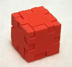 Happy Cubes are a set of mechanical puzzles created in 1986 by the Belgian toy inventor Dirk Laureyssens. The company "Happy bvba" has the exclusive license to manufacture and sell these puzzles.[1] Happy Cubes are also known by a number of other names, among them: "Cube It!" cubes, "Wirrel Warrel" (in the Netherlands), "I.Q.ubes" and "Cococrash" (in Spain and Portugal).