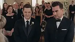 "Happy Ending" was written by Schitt's Creek co-creator and executive producer Daniel Levy, who directed the episode alongside Andrew Cividino. Writing for the season took about a month, as Levy tried to make sure he was giving each character the ending they deserved.[5] However, the finale was written in the span of three hours,[6] with Levy stating that the final script made him,[7] along with other cast members, cry several times during the episode's final table read.[8][9] As there weren't any minor characters with unresolved side stories, Levy was able to focus his attention mainly on addressing the Rose family.[5]