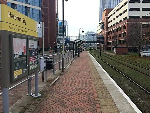 ![]() Harbour City Eccles-bound platform in November 2018, with the Manchester bound platform in the distance. | ||||||||||||||||||||||||||||||||||||||||||||||||||||||||||||||||||||||||||||||||||||||||||||||||||||||||||||||||||||||||||||||||||||||