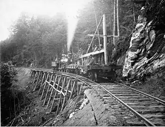The route was surveyed in the summer of 1895.[8]: 6 As local labor was used as much as possible, the actual work of grading the roadbed was delayed until the haying season was over. Much of the roadbed was cut from the sides of the hills, and grading was done with hand tools, wheelbarrows, and horse-drawn carts.[1]: 52? [8]: 7 Five miles of roadbed were graded in 1895, and the remainder was graded in the summer of 1896.[8]: 6 Grading work came to a halt when the ground froze, and the first rails were laid thereafter.[1]: 52 Wooden trestles were built to span gorges along the right of way. In a process that continued until 1904, the trestles were subsequently replaced with "grout" or waste stone, which was used to fill the ravines.[1]: 52 The fill was "fine" grout from the cutting sheds, as large blocks falling could have destroyed the trestle structures.[12] The largest—and last filled—of the gorges took 6,600 carloads of grout.[6]: 23 [1]