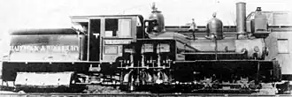The railroad’s first locomotive was the 4-4-0 Hinkley rod locomotive it leased from the Boston & Maine.[8]: 6 When this engine outlived its usefulness (largely because it could not ascend the steeper grades beyond Burnam Hill[8]: 7 ), the company bought a Shay locomotive (whose gear drive enabled it to handle steeper track) from the Barre & Chelsea.[8]: 7, etc. This was given the number 1 and named E.H. Blossom for the railroad’s general manager.[1]: 53 It had two trucks and eight 32.5-inch (83 cm) drive wheels, and weighed 40 tons.[8]: 11 This locomotive was used for the rest of the construction of the line, and then was the railroad's only service locomotive for several years.[1]