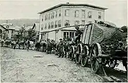 Largely as a result of the World’s Columbian Exposition in 1893, granite became a very popular building material for commercial and government buildings.[10][7]: 224 While the finer-grained granite of Barre was preferred for monuments and gravestones, the coarser-grained Woodbury stone found a market in "architectural" uses such as buildings and paving.[3] As demand grew, the granite-finishing operations in Hardwick began to look farther afield for sources of the raw stone. While some quarries had been opened in nearby Woodbury,[11] transportation of the stone to the finishing sheds was problematic: it was slow and difficult, and caused significant damage to the roads. The limitations of horse-drawn wagons would prevent much further growth in the local industry.[1] Ordinarily, a horse was needed for every ton of granite hauled by wagon.[8]: 4 It once took an 18-horse team three days to move a large column of rough granite from the quarry to Hardwick (a distance of 6 miles (9.7 km) or more, depending on the route), after which 20 road culverts needed to be rebuilt.[1][6] Such a team might be followed by a one-horse wagon loaded with axes, shovels, peavies, and other tools to repair the damage.[12] Transportation was somewhat easier in the winter, as the frozen ground would not give way, and snow allowed the use of sleds, which encountered less friction.[8]: 5