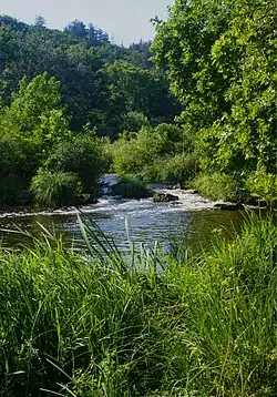 The river takes its source from the Velichka spring at an altitude of 755 m, situated near the second class II-58 road Asenovgrad–Kardzhali some 1.5 km west of the Panichkovo resort in the Eastern Rhodope Mountains.[1] It flows in a deep forested valley until the village of Boyan Botevo, where it turns southeast and flows through the Haskovo hills in a narrow shallow valley. Downstream of the village of Malevo the Harmanliyska reka turns in northeastern direction and after Stoykovo it bends eastwards, bypassing the Huhla ridge from the north in a valley with steep slopes on the right bank and oblique slopes on the left one.[1] It forms a 9–10 gorge before reaching the town of Harmanli, where the river flows into the Maritsa at an altitude of 73 m about 1.3 km northeast of the town. [1][2]