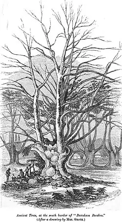 Then for reasons detailed by Harriet Grote in her Account of the Hamlet of East Burnham, they decided to leave the area.[3] According to Francis George Heath, writing on Burnham Beeches in 1879, "no right of estovers has belonged to the commoners of East Burnham, and the lord of the manor ... had alone the sole right of touching the trees."[32] Grote's work deals in part with "commoners' rights and privileges, and ... her efforts to maintain them on behalf of her poor neighbours".[33] In 1885, when the East Burnham Common was bought by the Corporation of London, it was considered that the commoners had rights of pasture and turbary, but not estovers.[34] There is evidence, however, that pollarding of the trees did occur in conjunction with pasturage.[35]