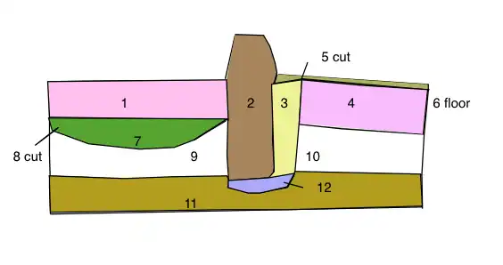 Starting at the bottom, the order events occurred in this section is revealed by the matrix as follows. Natural ground formation 11 was followed by the laying down of layers 9 and 10 which "probably" occurred as the same event. Then a shallow pit 8 was cut and then back filled with 7. This pit feature in turn was "sealed" by the laying down of layer 1 which is probably the same event as layer 4. Following this a major change in land use occurs as construction cut 5 is dug and immediately followed by trample off the feet of people 12 working in the construction cut 5 who then build wall 2 after which they backfill excess space between the wall 2 and cut 5 with backfill 3. Finally clay floor 6 is laid down to the right of wall 2 over backfill 3 indicating a probable interior surface.