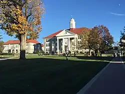 The approximately 100 acre Harrisonburg Downtown Historic District[61] embraces the historic commercial and institutional core of the city. The principal axis of the district is Main Street, which runs approximately north–south through the district. Another principal thoroughfare is Liberty Street, which parallels Main Street. The principal cross axis is Market Street (US Highway 33), which intersects with Main Street on the east side of Court Square.[62] The Romanesque Revival/Renaissance Revival 1896-97 Rockingham County Courthouse commands the square, and surrounding blocks arc densely developed with early twentieth century high-rise bank buildings and other commercial buildings from the 1870s through the 1950s. Most residential buildings dates to after the Civil War, when South Main Street developed as Harrisonburg's elite residential avenue. Notable houses from the period include Victorian/Queen Anne masterpieces such as Ute 1890 Joshua Wilton House and rarities such as the late 1880s Octagon House. Several fine Gothic Revival churches date to the early years of the twentieth century. Industrial buildings and warehouses date largely to the first half of the twentieth century and include the 1908 City Produce Exchange, a poultry shipping plant, and the late 1920s Maphis Chapman Co. gas storage tank factory. A complex of mid-twentieth century cinder block warehouses clusters near the 1913 Chesapeake Western Railway Station and the 1920-21 Rockingham Milling Co. roller mill on Chesapeake Avenue. Alter World War I automobile dealerships appeared in the downtown area. An outstanding example is the 1920 Rockingham Motor Co., an inspired Tudor Revival/Art Deco design. Architectural modernism achieved popularity in the 1940s and early 1950s at the end of the period of significance. Harrisonburg's downtown experienced a number of losses during the late twentieth century, but the recent rehabilitation of several key buildings demonstrates a growing commitment to the preservation of the district's historic character.[62]