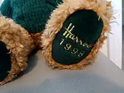 The Harrods Christmas bear is a teddy bear created by the Harrods department store in London, England in 1986. A limited edition Christmas bear is released every year to celebrate the holiday season, and bears from years' past have since become valuable collectors’ items.[1] They can be recognised by the Harrods logo and year of release embroidered on their left paw.[2]