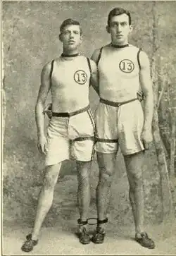 In addition to his responsibilities as a track coach, he occasionally coached the Dartmouth football team, likely in conditioning.[2][5] At Dartmouth, Hillman advised hurdlers to swallow raw eggs, which he believed to be "excellent for the wind and stomach." Some of the track athletes who were hurdlers or runners, sports in which he excelled, that he developed at Dartmouth were Don Burnham '44 in the mile; Gus Braun '15, Monty Wells '28, and Jack Donovan '38, in the hurdles. In the high jump, intercollegiate champions he trained included Russ Palmer '10, Roy Brown '23, and Tom Maynard '29. He also trained Mark Wright '13, C. E. Buck '13 and Laddy Myers '20 in the pole vault; Bud Whitney '15, Jack Shelburne '19, W. C. Beers '21, and Tony Geniawicz '37 in the shot.[3]
