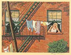 In the early 1930s a few American artists began experimenting with silk screen printing, a process then mostly used for posters, advertising, and similar applications.[38] In 1938 one of these artists, Anthony Velonis, convinced the Graphics Section of the WPA Art Project in New York City to set up a Silk Screen Unit.[39] With Velonis at its head, the artists in the unit were able for the first time to focus their energies on advancing silk screening as an artistic medium.[40] Called serigraphy or screen printing, the process quickly took hold in the New York art community.[41] In 1940 Edward Alden Jewell gave a concise description of the method. "A stopping out varnish is painted freely over a silk screen mesh," he wrote, "so that only the areas intended to receive color remain exposed. From three to thirty stencils may be prepared and properly registered with the total effect of an interesting gouache painting."[42] Harry Sternberg, one of the artists in the WPA group, later told an interviewer, "Posters and displays for store windows were screenprinted. It was a logical thing to do, to try to make [art] prints that way. We were all looking for a way to make inexpensive color prints. Prints were selling for $5 or $10 and we needed a cheap way to make them."[38]: 288 In an article published in 1964 Edward Landon, another member of the group, said the materials and equipment needed for serigraphy were affordable by virtually any artist. The method, he wrote, was easy to learn and any artist should be able to use it to create an edition of fine prints. At the same time it was so flexible that experienced serigraphers could make complex works of art.[43] Shokler was a member of the Silk Screen Unit. He later told an interviewer that in 1940, when the WPA project came to an end, he and about a dozen others rented a loft in a low-rent area of Manhattan's Lower East Side, where they perfected the technique and taught it to others.[32] The same year he also joined with former members of the unit to form an organization called the Silk Screen Group to promote and exhibit screen print works of art.[44] In 1944 the Silk Screen Group renamed itself the National Serigraph Society.[45] Shokler served as the society's president twice during its early years.[32] The group ceased to exist in 1962.[46]
