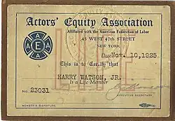 Harry Watson Jr. Actors' Equity Association card