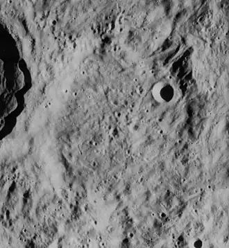 Hartwig is a lunar impact crater that is located near the western limb of the Moon. It is attached to the eastern rim of the prominent crater Schlüter, to the northeast of the Montes Cordillera mountain range that surrounds the Mare Orientale. To the east-northeast of Hartwig is the larger crater Riccioli.