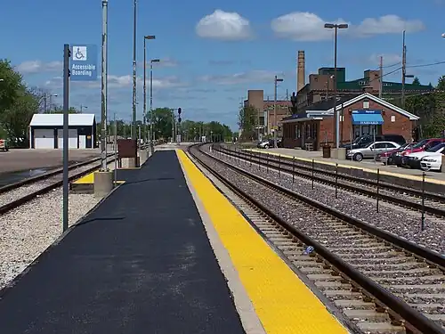 Harvard station is a Metra commuter rail station in Harvard, Illinois. It is the terminus of the Union Pacific Northwest Line. Harvard is the farthest Metra station from Chicago at 63.16 miles (101.65 km) from Chicago; the next furthest stop, Antioch on the North Central Service, is over 10 miles closer to Chicago at 52.9 miles (85.1 km).[2] The station contains a parking lot operated by the City of Harvard. A coach yard is adjacent to the station and is used to store trains during weekends and overnight hours. Harvard was the only Metra station located in the M zone, until all fare zones beyond J were retired by Metra in 2018. Trains that traveled to Chicago passed through an entire fare zone to reach Woodstock. No stations were located in zone L. Originally, Hartland was the only station located in zone L, however, the stop was closed in 1984. Harvard was then located in fare zone J until February 2024, when the fare structure was simplified across the system. Harvard is now in Zone 4. It is the westernmost station of the Metra system; the next most westerly stop is Elburn on the Union Pacific West Line. Harvard is the last station to use more than one track, as further beyond this station, the UP line is single tracked until reaching Janesville, Wisconsin.