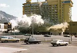 The hotel suffered an explosion from a bomb on August 27, 1980, that left a crater three stories deep when it was detonated by the FBI. (The area around the hotel had been cleared and no one was injured.) The bomb caused an estimated $18 million ($62 million in 2024) in damages. Parts of Harvey's casino reopened within 48 hours, and the fully repaired and renovated hotel reopened in May 1981.[2] The bomb was placed by John Birges, a heavily in-debt Fresno landscaper who had lost at least $1 million at casinos in Stateline and was hoping to extort $3 million from the bomb threat. He was convicted and sentenced to life in prison without the possibility of parole, where he died from liver cancer in 1996.[3]