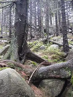 There are various vegetation zones in the Harz National Park. In the sub-alpine area above 1050 metres is the "battle zone" of the spruce tree. Here it is not uncommon to find trees over 250 years old and bent into bizarre shapes by the wind. But predominant here are the dwarf shrub heaths and raised bogs (Hochmoore). The altimontane vegetation zone is found between 750 m above sea level (NN) and 1,050 m above NN, dominated by spruce. These areas can be found in the vicinity of Schierke and Torfhaus. Not until the montane zone between 450 m above NN and 750 m above NN and the submontane zone is the vegetation dominated by beech forests. Today's beech stands grow primarily on acidic soil. The most commonly encountered forest type is the Hainsimsen beech forest. At heights above 700 m it is usually adjacent to spruce-beech mixed woodland. But in the national park this area has shrunk to just a few residual stands and has been largely replaced by spruce. In the region of Ilsenburg spruce monoculture occurs even down to 230 m above NN. In these zones the spruce is not native and, as a result of climate change, it has suffered increasingly from bark beetle infestation. Currently the National Park Service is having these areas reforested to encourage the original beech and maple, that used to dominate them, to resettle.[4][5][6]