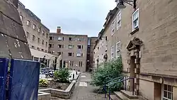 The oldest part of the college site is likely what is now the dining room, believed to date back to the 17th century.[2] It originally formed part of a town house owned by a wealthy member of local society, and was converted in 1760 into a coaching inn, The Red Lion – a stopping point for coaches travelling between London and Edinburgh.[22] During this time it also hosted concerts, probably featuring the work of composers like Charles Avison and John Garth.[34] In 1799 the old coaching inn reverted to being a private residence.[22] In 1845, it was sold to the university, and emerged as the first component of the newly founded Hatfield College the following year.[2] Much more extensive when first occupied by Hatfield, since then "substantial parts of the building" have been replaced by newer structures.[22] Apart from the dining room, what remains are spaces adjoining it that were once used by travellers, but are now filled by the Senior Common Room (SCR) – formerly a card room – the SCR dining room; and finally, on the higher floors, the 'D Stairs' student accommodation block, which comprises 13 twin rooms.[22][35] D Staircase has had a reputation for being haunted by a female spirit, recognisable by the aroma of a distinctive perfume.[36]
