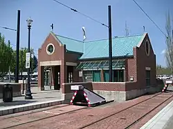 The north end of the station features a light-red brick and green-roof building that contains space for use by the train and bus operators.[9] The building is postmodern in style and includes rose windows, false chimneys, and gables.[10] The entire station was designed by the architectural firm OTAK Inc. and also includes an electrical substation.[9] Hatfield's name is etched in the façade of the main station building in stone.[2]