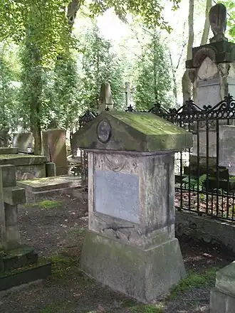 Most of the Haukes living in Warsaw in the first half of the 19th century are buried at the Catholic Powązki Cemetery in Warsaw, those who were Lutherans or Calvinists (mostly Protestant women who married into the family) repose at the Lutheran and Calvinist Cemeteries of the Polish capital. Solely John Maurice and his wife lie in the crypt of the Capucin church in Warsaw's Old Town.