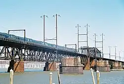 Two railroad mainlines pass through Havre de Grace. More than 80 daily passenger trains on Amtrak's busy Northeast Corridor speed through the city at 90 miles per hour (145 km/h) on an elevated line connected to the adjacent Amtrak Susquehanna River Bridge.[30] The double-track bridge was built by the Pennsylvania Railroad between 1904 and 1906 for its New York City–Washington, D.C. line. (The bridge replaced a wooden single-track railroad bridge, completed in 1866 by the Philadelphia, Wilmington, and Baltimore Railroad, whose piers can still be seen from the city's David R. Craig Park.) The Philadelphia Subdivision of CSX Transportation, originally built by the Baltimore and Ohio Railroad, carries a heavy volume of freight across the river on the CSX Susquehanna River Bridge, rebuilt between 1907 and 1910, about 1 mile (1.6 km) upstream of the Amtrak bridge.[30]