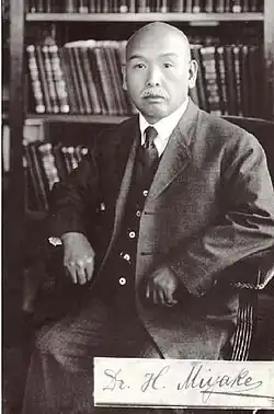 Hayari Miyake (Japanese: 三宅 速, romanized: Miyake Hayari; 16 March 1866 – 29 June 1945) was a Japanese surgeon specializing in gastrointestinal and central nervous system surgeries. He was an assistant to Julius Scriba, a professor of surgery at Tokyo Imperial University, and later became a student of Jan Mikulicz-Radecki, a German-Polish-Austrian surgeon. Miyake headed the Department of Surgery at Kyushu Medical School, where he taught Hakaru Hashimoto, the discoverer of Hashimoto's thyroiditis. Miyake served as the president of the Japan Surgical Society and was a long-time friend of theoretical physicist Albert Einstein.