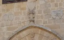 The oldest part of the house is the exterior as the interior was repeatedly rebuilt in Ottomans times. The doorway is a pointed arch with moulded voussures under an elaborate hood mould, which terminates in a well-preserved crocketed finial supporting the shield of the Royal Arms of Cyprus (namely of the Lusignan kings), although this shield is defaced or damaged. On either side of this shield are two pairs of smaller shields, each pair bracketed together. The right-most of these is in better condition and bears the common Italian design "Ondato" (i.e. waves). Within the apex of the arch is a smaller shield, probably of the house of Dampierre.[4]