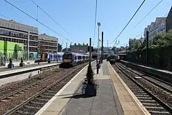 Since December 2006, the station features four through platforms along with a single bay platform sited on the north side of the station.[8] As a general operating rule, trains to and from stations across the Forth Bridge tend to use Platforms 1 and 2, while those trains running to and from Glasgow and the West Coast Main Line make use of Platforms 3 and 4. The bay platform, which is presently designated as Platform 0, was built for services that terminated at Haymarket, which has often occurred when major engineering works take place at the larger Waverley station.[7] All of the station's platforms are now electrified.