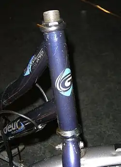 The head tube is the part of a cycle's tubular frame within which the front fork steerer tube is mounted.[1] On a motorcycle, the "head tube" is normally called the steering head. On bicycles the manufacturer's brand located on the head tube is known as a head badge.