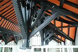 Internally, the church is unusual in having a vast and complex timber roof structure rather than the usual stone arches. In the main internal space, the roof is supported by four pairs of tall, slender cast iron columns, quatrefoil in section and with moulded collars and foliated capitals. These columns support fretwork spandrels, pierced with dagger motifs and quatrefoils which in turn support dark stained rafters decorated with a sawtooth pattern. The ceiling is painted a deep orange colour between the timbers, but was originally white. Though all original seating has been removed, evidence of raked pews is visible on wall surfaces on the gallery above the main entrance.[1]