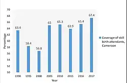 In Cameroon, there has been a drop from 63.4% in 1990 to 56.8% in 2000 and then an increase to 67.9% in 2017.[9] However, Globally, the 81% of live births worldwide occurred with the assistance of a skilled health personnel in 2018, up from 62% in 2005 and 69% in 2012 whereas that of Sub-Saharan Africa is just 59%in 2018.[16]