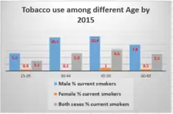 From the Table above, Tobacco relatively used in rural 4.3% than urban 3.9% for both sexes current smokers. The percentage of male's current smokers among 45-59 age group 10.4%, 1% Female's and both sexes’ current smokers are 6.5% and the use of tobacco among this age group shows increasing when compared to others age group in 2015. The overall tobacco use among adults age (15+) were 4.2% in 2015 and declined to 4% in 2016. Smoking prevalence of males were high according to both residences and among all age group when compared to females.