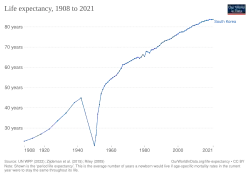 Life expectancy has been rising rapidly and South Korea ranked 3rd in the world for life expectancy [1] (previously 11th in 2016[2]). South Korea has among the lowest HIV/AIDS adult prevalence rate in the world, with just 0.1% of the population being infected, significantly lower than the U.S. at 0.6%, France's 0.4%, and the UK's 0.3% prevalence rate. South Korea has a good influenza vaccination rate, with a total of 43.5% of the population being vaccinated in 2019 (80.8% of people over 65).[3] A new measure of expected human capital calculated for 195 countries from 1920 to 2016 and defined for each birth cohort as the expected years lived from age 20 to 64 years and adjusted for educational attainment, learning or education quality, and functional health status was published by The Lancet in September 2018. South Korea had the sixth highest level of expected human capital with 26 health, education, and learning-adjusted expected years lived between age 20 and 64 years.[4]