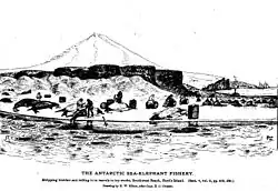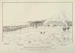No landing took place on the islands until March 1855, when American sealers from Corinthian, led by Erasmus Darwin Rogers, went ashore at a place called Oil Barrel Point. From 1855 to 1882 a number of other American sealers spent a year or more on the island, living in appalling conditions in dark smelly huts, also at Oil Barrel Point.[19] The island was also exploited by Australian sealers, including James William Robinson's 1858 expedition on behalf of Tasmanian merchant William Crowther. Robinson's memoir of the expedition was deposited in the W. L. Crowther Library and provides one of the most detailed accounts of early conditions on the island.[20] At its peak the community consisted of 200 people. By 1877, sealers had wiped out most of the seal population and left the island. In all, the islands furnished more than 16 thousand cubic metres (4.3 million US gallons) of elephant seal oil during this period.[19]