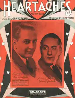 Al Hoffman composed "Heartaches" after moving to New York City in a bid to become a successful songwriter; though it was not initially a major hit, it has been described by Billboard as Hoffman's first great song.[1] The song's lyrics were written by John Klenner.[2] A 1931 recording by Guy Lombardo and his Royal Canadians on Columbia (catalogue number 2390-D), was a modest success.[3] Another early version was issued by Sid Phillips & his Melodians with Al Bowlly providing the vocal. This recording was made in London in late August 1931 and released on the Edison Bell Winner label (EBW 5358).[4]