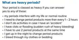 Symptoms of heavy menstrual bleeding, according to the decision aid from NHS England.[8]
