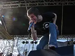 However, some nu metal songs have lyrics that are about other topics. P.O.D. have used positive lyrics about promise and hope.[67] Drowning Pool's "Bodies" is about moshing.[68] Wayne Swinny of Saliva said that the band's song "Badass" was "meant to be one of those 'sports anthem kind of songs' ".[69] According to Josh Chesler of the Phoenix New Times, the lyrics of Deftones, whose style is a mix of nu metal and post-hardcore, "tend to have complex allusions and leave the songs open to many different interpretations."[70] Raw Alternative praises the lyrics on Incubus' Make Yourself (1999), noting they are not "as angst-y as most of its nu metal contemporaries either, and instead takes turns into the philosophical and ethereal."[71] Michael Siebert states that a "significant portion of the genre's appeal was in the lyrics", with Korn and other groups dealing with "transgressive themes"; Linkin Park "frankly addressing suicidal ideation and alienation"; and Slipknot and Mudvayne expressing "nihilistic rage".[72]