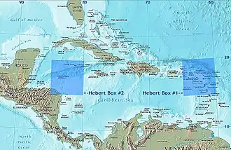 An Hebert Box (pronounced AY-bear, also known as Hebert's Box) is one of two regions of the tropical Atlantic Ocean that are useful as predictors of hurricanes that will strike South Florida, US. They are named for former National Weather Service and National Hurricane Center forecaster Paul Hebert, who observed in the late 1970s that most strong hurricanes (characterized as those with winds exceeding 110 miles per hour (177 km/h)) which had struck South Florida since 1900 had also passed through one of these two small 335-mile-by-335-mile (517-km-by-517-km) square geographic regions.[1]