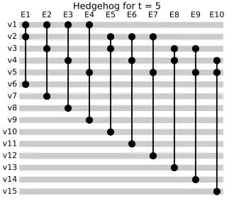 In the mathematical theory of hypergraphs, a hedgehog is a 3-uniform hypergraph defined from an integer parameter . It has vertices, of which can be labeled by the integers from to and the remaining of which can be labeled by unordered pairs of these integers. For each pair of integers in this range, it has a hyperedge whose vertices have the labels , , and . Equivalently it can be formed from a complete graph by adding a new vertex to each edge of the complete graph, extending it to an order-3 hyperedge.[1][2]