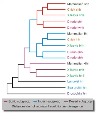 Lancelets, which are primitive chordates, possess only one homologue of Drosophila Hh (figure 7). Vertebrates, on the other hand, have several Hedgehog ligands that fall within three subgroups – Desert, Indian and Sonic, each represented by a single mammalian gene. This is a consequence of the two rounds of whole genome duplication that occurred early in the vertebrate evolutionary history.[65] Two such events would have produced four homologous genes, one of which must have been lost. Desert Hedgehogs are the most closely related to Drosophila Hh. Additional gene duplications occurred within some species[15] such as the zebrafish Danio rerio, which has an additional tiggywinkle hedgehog gene in the sonic group. Various vertebrate lineages have adapted hedgehogs to unique developmental processes. For example, a homologue of the X.laevis banded hedgehog is involved in regeneration of the salamander limb.[66]
