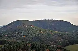 On its western slopes is the Buchkammerfels, a striking rock formation in which, in a rock spur with vertical sides, there is what is suspected to be the site of a castle that consisted of inaccessible rock chambers (known as Buchkammern or Heidenkammern).[1] The rock chambers are first mentioned in 1635, where they are described as dungeons. This function is just as unverified as the theory that they might have been used by the inhabitants of Drachenfels Castle as an outlying observation post.[1]