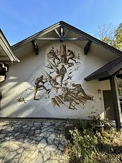 In the 1970s, Heinz Gaugel created a remarkable sgraffito for a private residence in Pataskala, Ohio. This intricate piece, which is installed on the exterior of the home, depicts scenes of early logging, portraying the strength and skill of the loggers as they work. The earthy tones and dynamic figures capture the intensity of labor in the natural environment. This artwork, crafted in Gaugel's signature style, integrates seamlessly with the architectural design, enhancing the rustic charm of the home while providing a unique glimpse into American labor history. The piece is one of several large-scale sgraffito works by Gaugel, who was known for his attention to historical detail and ability to depict human effort in monumental form.