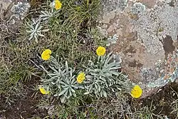 This perennial herb grows 8โ60 cm (3.1โ23.6 in) tall.[1] The rootstock is woody.[2] The leaves form a rosette at the base and sometimes also higher up the stem. The leaves growing at the base are the largest.[1] They are oblanceolate in shape and are silvery and silky.[2] Dense, many flowered flower heads are present between March and June. The flowers grow in cylindrical cymes located at the ends of branches.[2] The outer parts of the flowers are brown or straw coloured and the insides are tipped with bright yellow.[1]