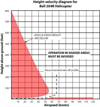 Likewise, an increase in height without a corresponding increase in airspeed is dangerous, as a crash from this height may not be survivable. Airspeed has to increase beyond the 40–80 knot range, allowing the safe initiation of an autorotation. Thus a safe take-off profile, initiating forward flight from a low hover, involves gaining height as airspeed approaches a safe autorotation speed.[1]